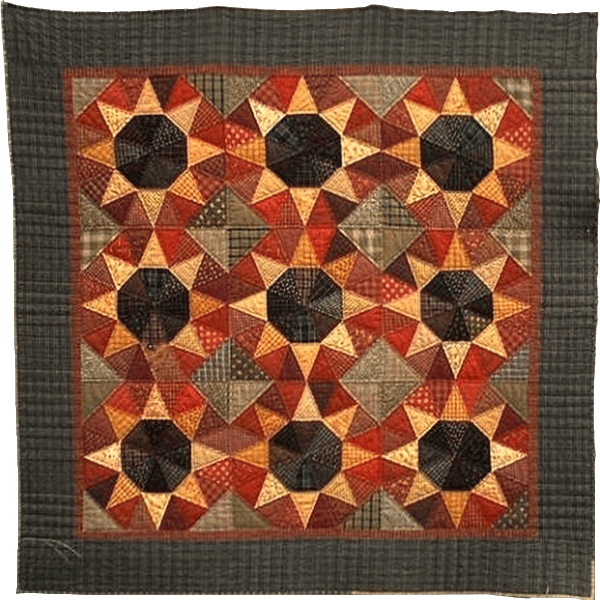 The original Auntie Bean’s Stalks measures 81 inches square. However, a smaller version was made for the cover of the pattern, only 9 blocks. It measures 64 1/2 inches square