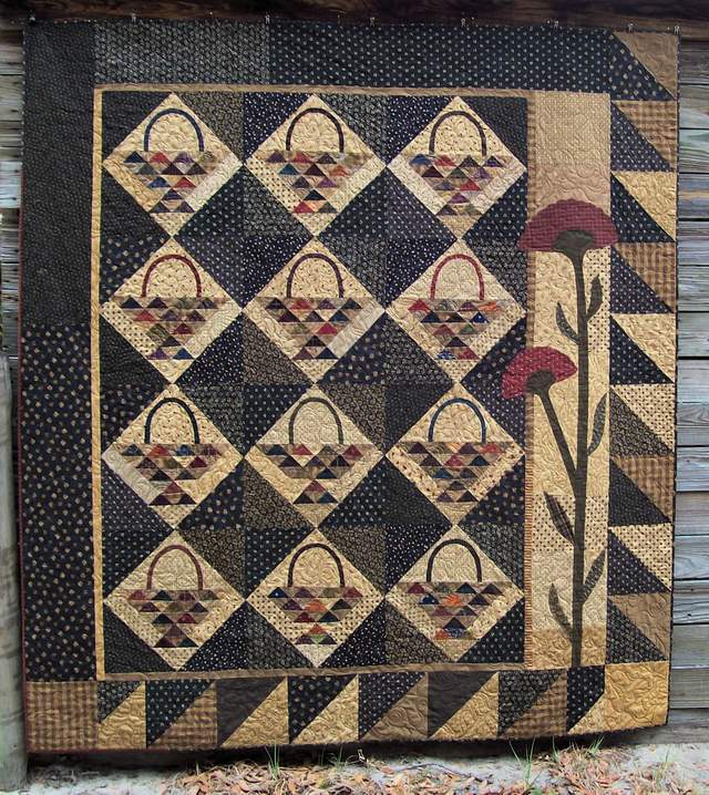 I'm not sure how often the gathering of vegetables, flowers, wood or whatever took place in the Cameron household, but, I do know from the stories I've heard that perhaps the "gathering" came about when gramma wanted a little time to herself. After all, raising 11 children must have taken its toll a time or two. When I started making this quilt I did think of gramma. She had some wonderful baskets and also an assortment of tin buckets that were used to gather berries, but you've already heard about that in Aunt Ree's Raspberry Jam. She had a wonderful garden and I have a fun picture of my sister, when she was just a toddler, helping gramma and my mom gather vegetables ..... do you suppose she was much of a helper? Let me introduce you to Gathering Baskets.
